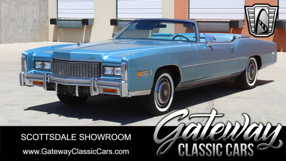 Gateway Classic Cars of Scottsdale is pleased to present for sale, on consignment, this comfy cruiser, a 1976 Cadillac Eldorado Convertible! The 1976 model was part of the ninth generation Eldorado that was produced from 1971-1978. This 1976 model marked the last year of the convertible option on the Eldorado which makes it a rich piece of Cadillac history. Measuring in at a healthy 18.7 feet, this Innsbruck Blue convertible with blue interior is an experience in comfort and luxury. Features and Options include A/C (R-134), AM/FM Radio, Power Convertible Top with Parade Boot, Cruise Control, Hub Caps, Leather Seating, Power Brakes, Power Locks, Power Seats, Power Windows, Radial Tires, Seatbelts, Carpeted Trunk, Tilt Steering and Wide White Wall tires. After 20 years of ownership it's time for the next lucky person to take the wheel and drive this baby. Give our sales staff a call, text or email to learn all about the purchase process and thank you for looking!