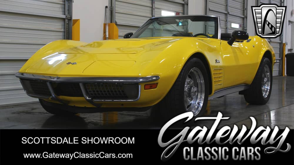 Gateway Classic Cars of Scottsdale is pleased to present for sale, on consignment, this eye catching 1971 Chevrolet Corvette Convertible. 21 blissful years of ownership has come to an end. Now is your chance to pick up this very well loved and well documented Corvette. The owner has reported to us that he was fortunate enough to get his hands on a new crate ZZ430 engine back in 2003. At the time this was the highest horsepower small block crate engine GM Performance Parts had ever produced. While he was at it he decided to pair the ZZ430 with a new Keisler Engineering Tremec 5 Speed Manual for a really great combination. Features and Options include Vintage Air Air Conditioning, Custom Billet Aluminum Wheels, Nitto Performance Tires, AM/FM/Bluetooth Radio, Manual Convertible Top, Power Brakes, Power Steering, Tilt Column, Telescopic Steering Wheel, Rear Coilover Kit, FI Tech Fuel Injection, Wipers and Headlights Converted to Electric, Digital Gauges and Seatbelts. There are plenty of other notable upgrades and maintenance items done that are available on request. One thing is undeniable, this car was very well cared for, all the upgrades were well thought out with the goal in mind to improve either the driving experience or to improve on areas Chevrolet fell short on. Contact our sales staff today by phone, text or email for all the details and thank you for looking!