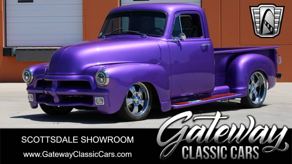 Experience the blend of classic charm and modern convenience with this stunning 1954 Chevrolet 3100. This vintage beauty boasts a captivating purple exterior that is sure to turn heads wherever you go. Step inside to find a luxurious gray leather interior that complements the bold exterior, offering both comfort and style for your driving pleasure.