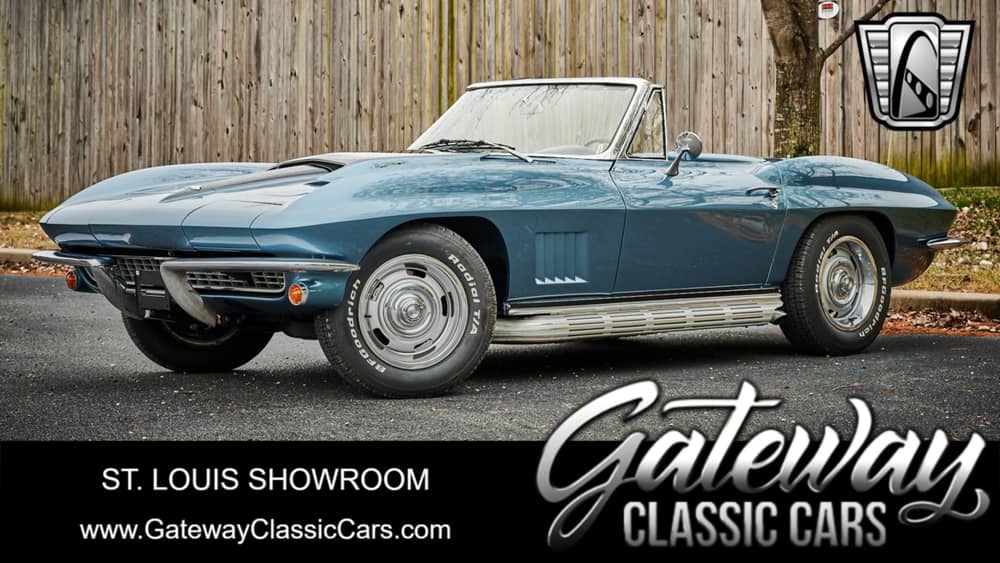 Gateway Classic Cars of STL is proud to offer this sharp 1967 Chevrolet Corvette Stingray Convertible. The 2nd generation of Corvette is arguably one of the most desired body styles built to this day. In 1967 only 22,940 cars were produced that year. Of that 8,504 1967 Corvette Coupes and 14,436 Convertibles were produced. Even fewer came with the 427 CID Big Block V8, this example even has the Tri-power 3x2 carburetor/intake set up. This monster of an engine was factory rated at 435HP and is mated to a Muncie M-22 "Rock-crusher" 4-speed manual transmission. According to the owner of this beast, the engine was rebuilt in 2022. Walking around this '67 Stingray, one should notice the Lyndale Blue metallic gloss paint that is offset with a black center stripe down the Big Block hood. Adding to the curb appeal is a replaced black manual soft top, dual side exhaust pipes, pop up headlights, chrome bumpers, 427 badging, and 15" Rally styled alloy wheels wrapped in white letter radial tires. The interior flows well with the paint sporting black vinyl bucket seats, black dash, black carpeting, woodgrain steering wheel, and even a white shifter knob. If you are looking to add a C2 Corvette to your collection, it doesn't get much more desirable than this example.