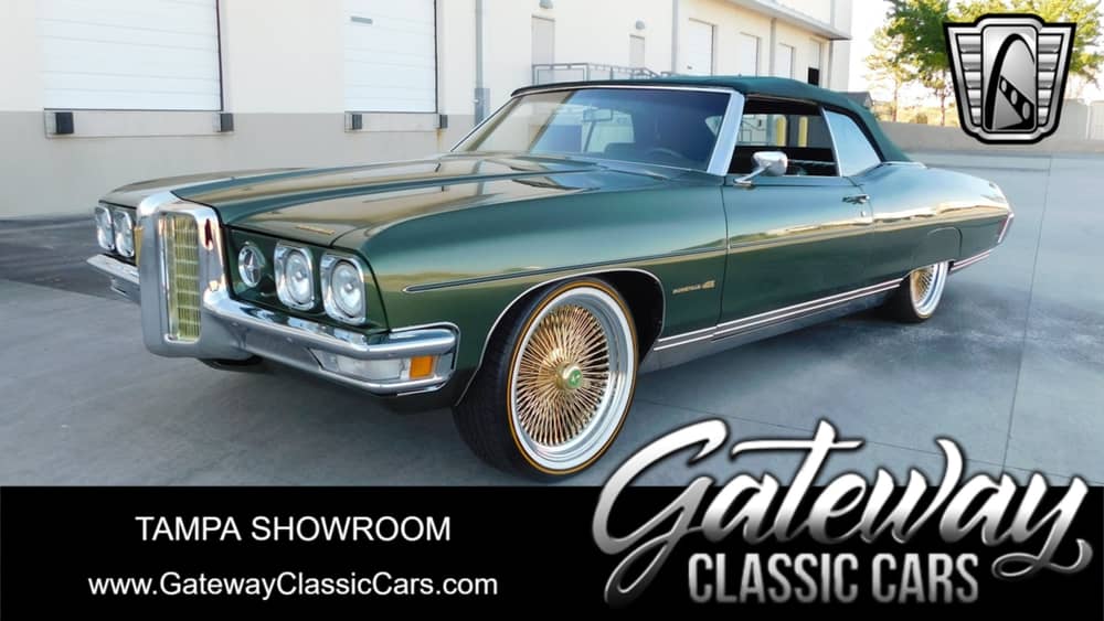 Gateway Classic Cars of Tampa is proud to offer this ultra clean, custom 1970 Pontiac Bonneville Convertible. The front and rear styling on full-size Pontiacs was a one year only affair. This makes for an appealing car to make a statement, ensuring you won't see yourself at every car meet! The seller of this lovely 1970 Bonneville convertible acquired this car in Colorado and set to building one of the cleanest big body drop tops on the streets. First your eyes are captured by a rich coat of Mountain green over the original green interior. The roof was replaced with a custom dark green rag top with a glass back window. You can't miss the 'old school' 20" gold wires wrapped in Vogue tires, a great looking set-up! A big cruiser like this, needs grunt to match the show. Fortunately, this big Bonnie packs a healthy, rebuilt 455 under the hood. In combination with the 400 3-speed trans, this big vert has no problem getting down the road, and the custom dual exhaust make sure everyone knows when you're coming and going. The afore mentioned interior is as mint as they come. So much so you'd think the car is new. No dash cracks, or rips in the seats here. A custom center console houses the aftermarket radio controls, so you can bump the thousands of watts of sound with ease. There are custom speakers lining the doors and four 12" woofers in the back. When it comes to sound, this Bonneville BUMPS. The icing on the cake is all the factory power features are in working order. From the power windows, roof, and ice-cold AC. If you want to turn heads with class and style and it must be done in a big way, this awesome 1970 Bonneville convertible is the car for you!