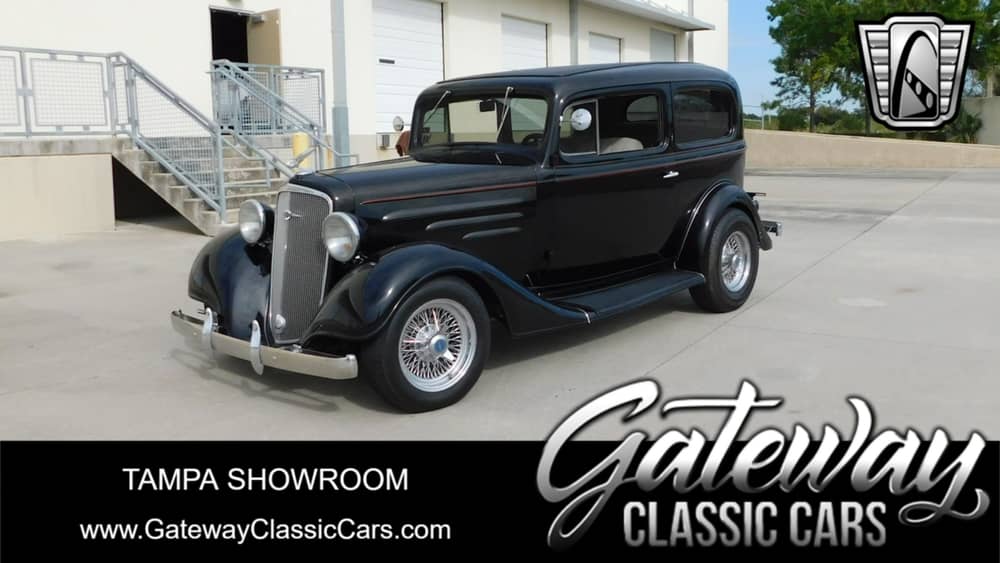 Gateway Classic Cars of Tampa is proud to present this 1935 Chevrolet Two Door Sedan. Most 30s vintage hot rods and customs are Fords, but this 1935 Chevy will make you do a double take and reconsider your options! This timeless beauty is finished in mile deep black paint over a set of sharps wire wheels and low profile tires. Inside you're greeted with grey cloth interior, a full compliment of gauges and tilt steering, plus cold AC! Power is provided buy a stout 350 V8 backed by a three speed automatic transmission. It's got plenty of room and runs and drives well. An older build but a high quality execution. This 1935 Chevrolet two door sedan is an experience in classic motoring with a modern touch. Stand out from the crowd and add this classy Chevy to your garage before it's gone!
