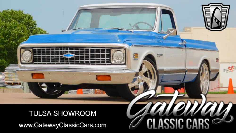 Gateway Classic Cars of Tulsa is proud to digitally represent a classic piece of American automotive history: the 1972 Chevrolet C10. This iconic pickup truck is presented in a striking two tone blue and white exterior that complements its blue/white houndstooth interior, creating a cohesive and timeless look. Under the hood, you'll find a robust and rebuilt 6.0L LS V8 engine paired with an automatic 4L60E transmission, offering a driving experience that is both powerful and smooth.